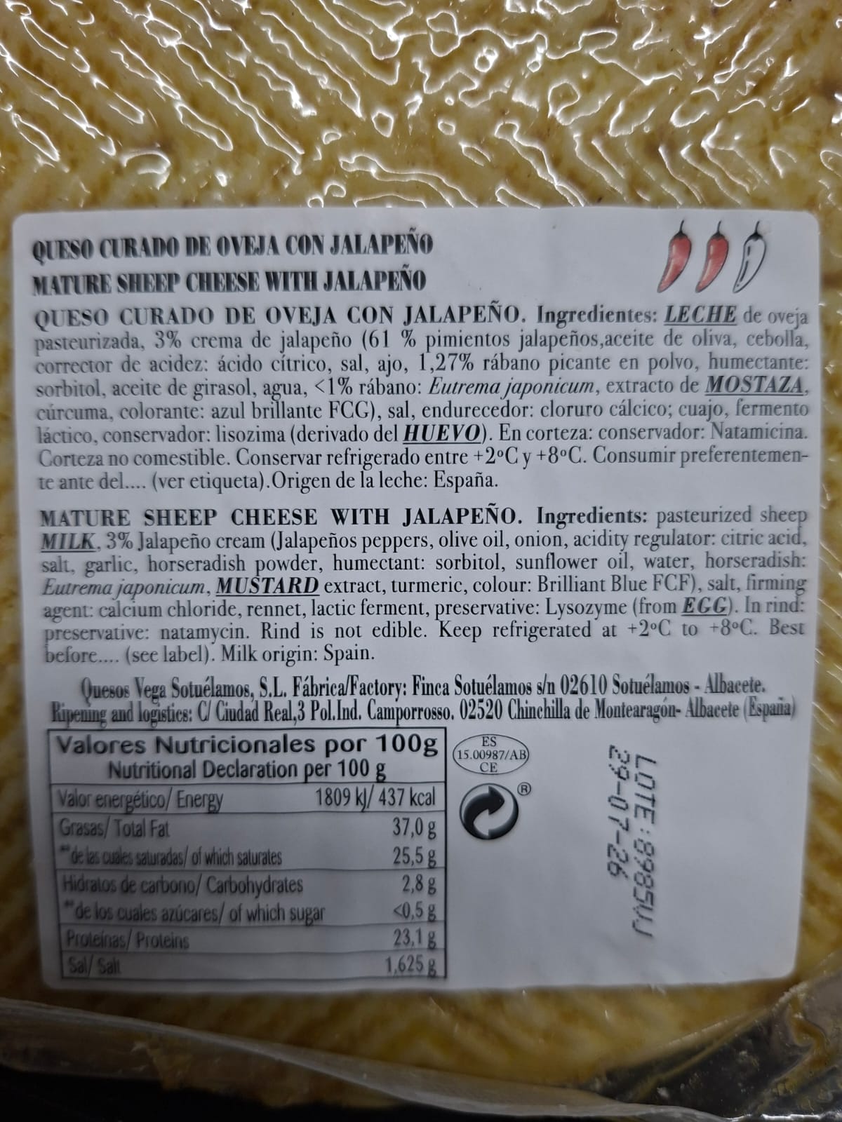 Manchego con trozos de chile jalapeño, aporta un toque picante y especiado.